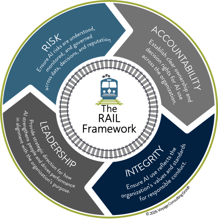 The RAIL Framework focuses on four areas that determine whether AI strengthens or weakens your work and your organization: Risk, Accountability, Integrity, and Leadership.